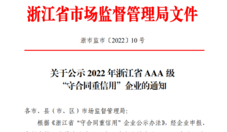 米兰(中国)蝉联省AAA级“守合同重信用”企业称号