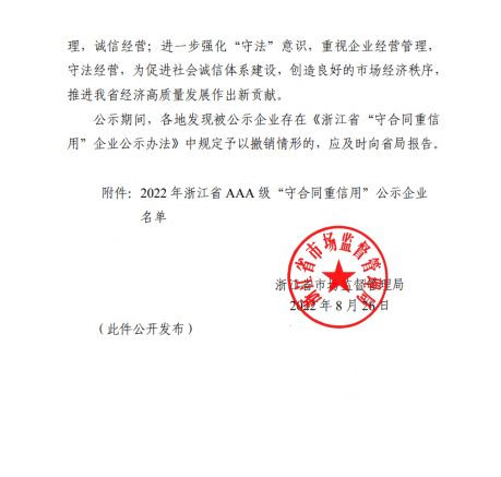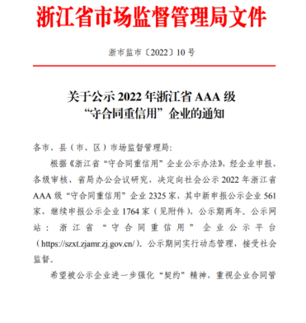 近日,浙江省市场监督管理局发布《关于公示2022年浙江省AAA级“守合同重信用”企业的通知》,米兰平台凭借良好的市场信誉和优质的管理服务,顺利通过各级市场监管部门严格的审核程序荣登榜单,再次被续展评定为AAA级“守合同重信用”企业。